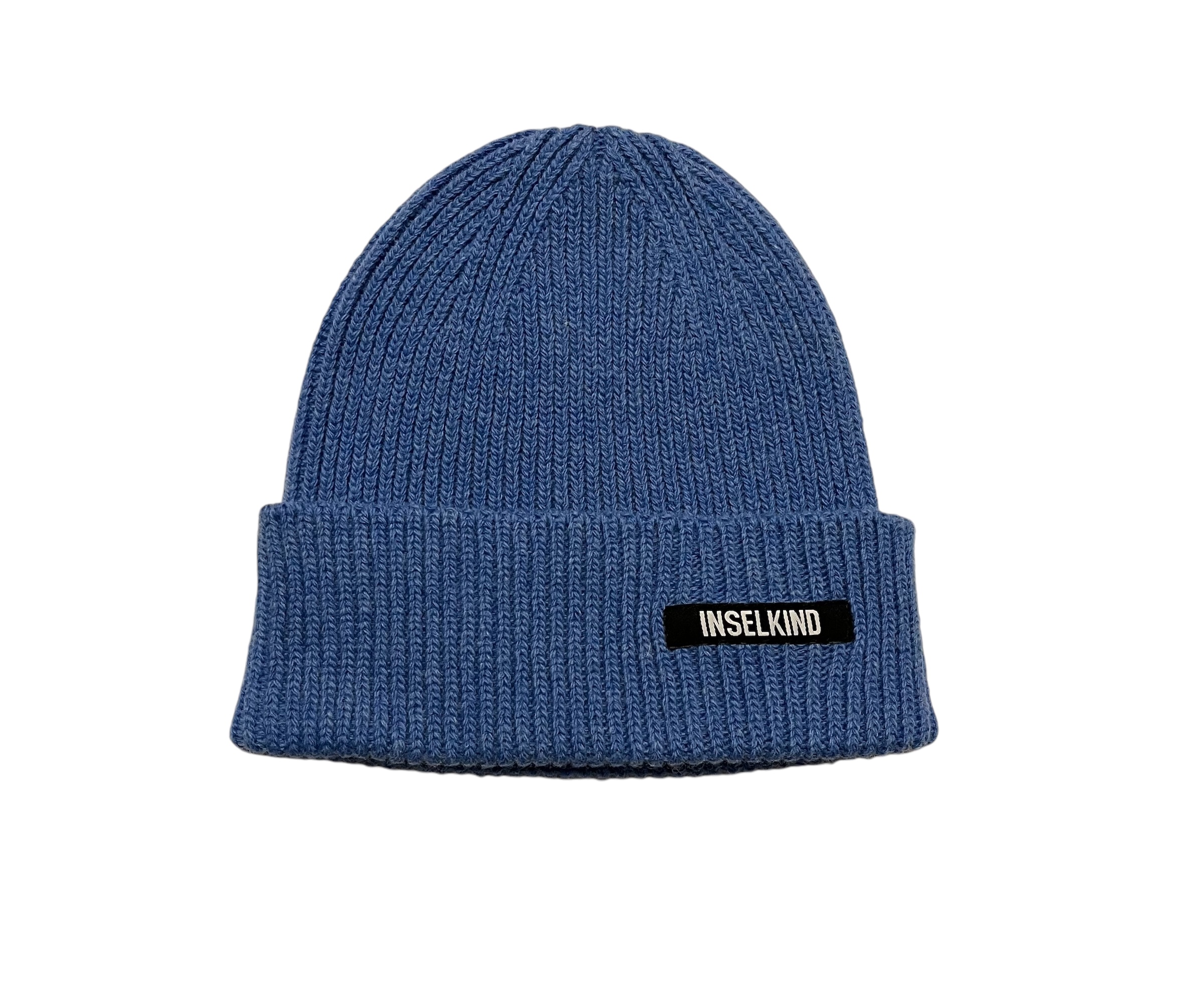 Inselkind Unisex Beanie aus Wolle Schriftzug / Royal